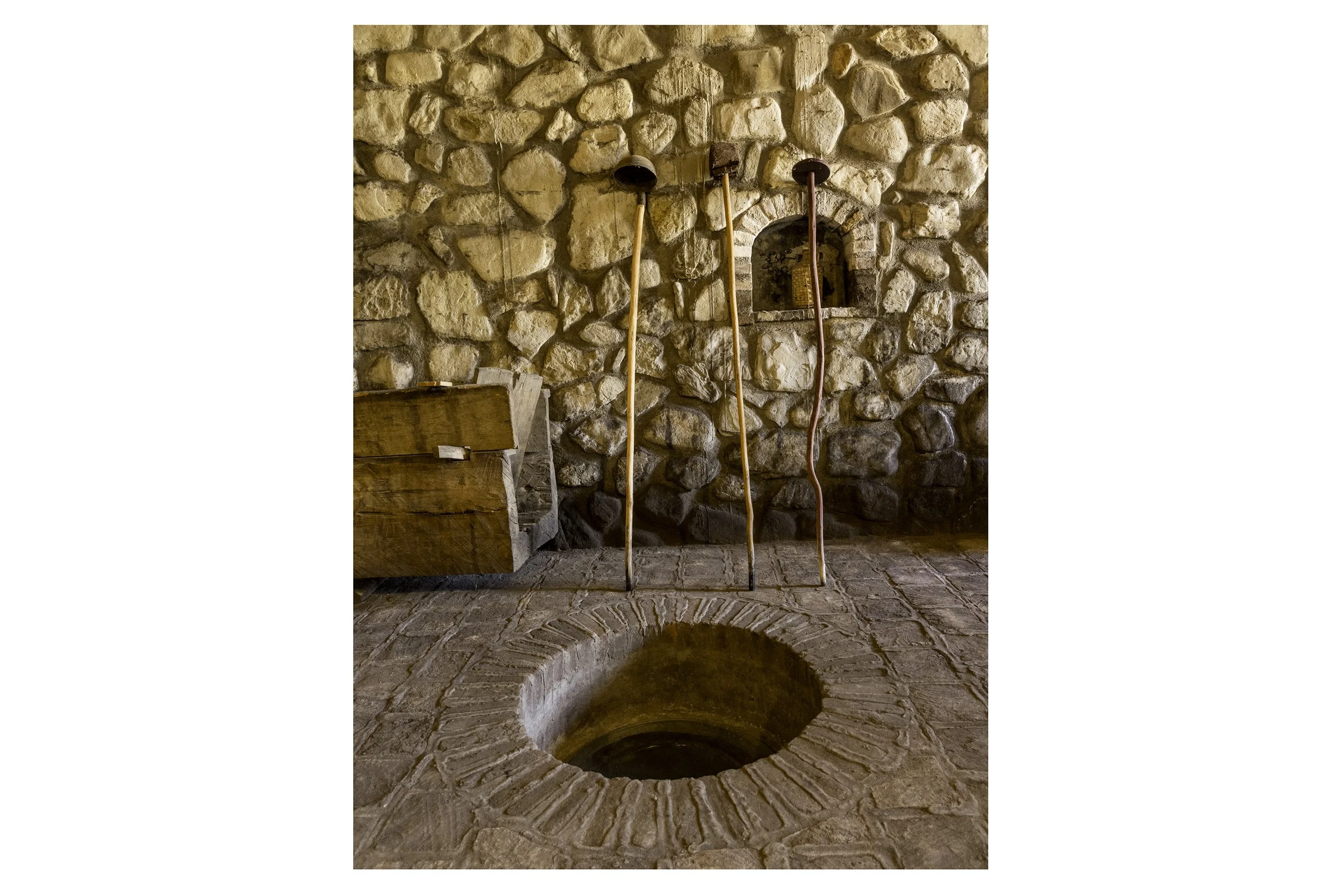 Georgian qvevri cellar tools leaning against a stone wall at a Georgian winery.